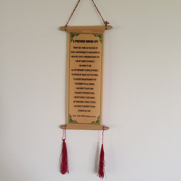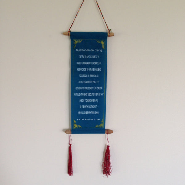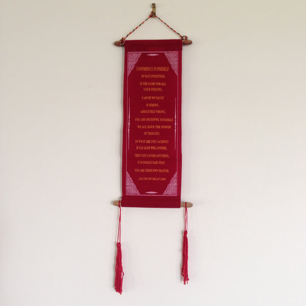 These wall hangings are inscribed with quotes of His Holiness 14th Dalai Lama of Tibet. Always a reminder of the deeper meaning of this life. Small:  28 x 12.5 cm...